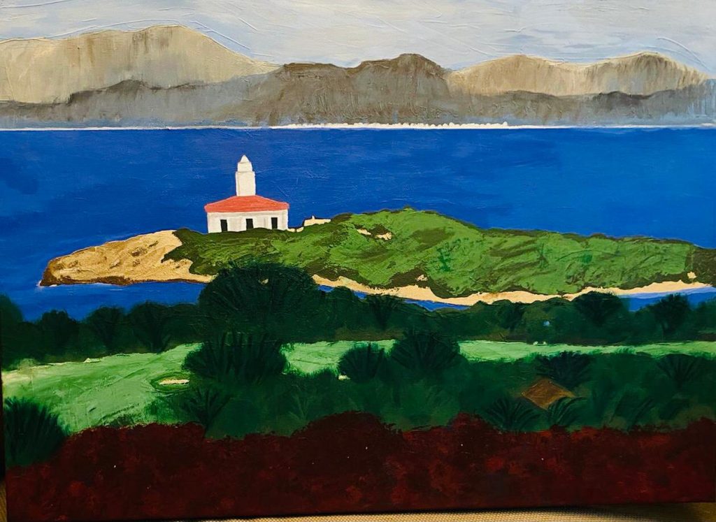 Aucanada ist ein kleiner Küstenort auf Mallorca. Das Kunstwerk zeigt den Blick vom Golfplatz auf eine kleine Insel mit einem Leuchtturm. Der Blick vereint das atemberaubende Meer mit der beeindruckenden Berglandschaft der Serra de Tramuntana. Mein Sehnsuchtsort auf dieser wunderschönen Insel.