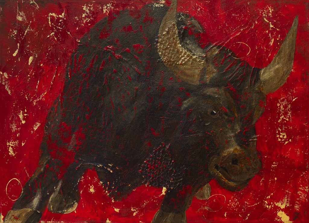 Mit kraftvollem Vorwärtsdrang durchbricht der Börsenbulle den Raum. Sein Körper ist in Bewegung, der Blick fokussiert, die Energie gebündelt – ein Moment kurz vor der Entladung. Die dominante rote Fläche steht für Markthitze, Volatilität und den emotionalen Rausch der Börse. Breakout zeigt den entscheidenden Augenblick, in dem Zurückhaltung endet und Dynamik übernimmt. Breakout markiert den Höhepunkt der Serie Rausch der Märkte. Der Börsenbulle ist nicht mehr Beobachter, sondern Akteur – seine Bewegung steht für den entscheidenden Moment, in dem Märkte ihre Begrenzungen überwinden. Mein Kunstwerk verbindet emotionale Marktdynamik mit zeitloser Symbolik von Stärke, Entschlossenheit und Wachstum. Als dritter Teil des Dreiklangs Porthos – Aufschwung – Breakout bildet es den konsequenten Abschluss meiner kraftvollen Erzählung.