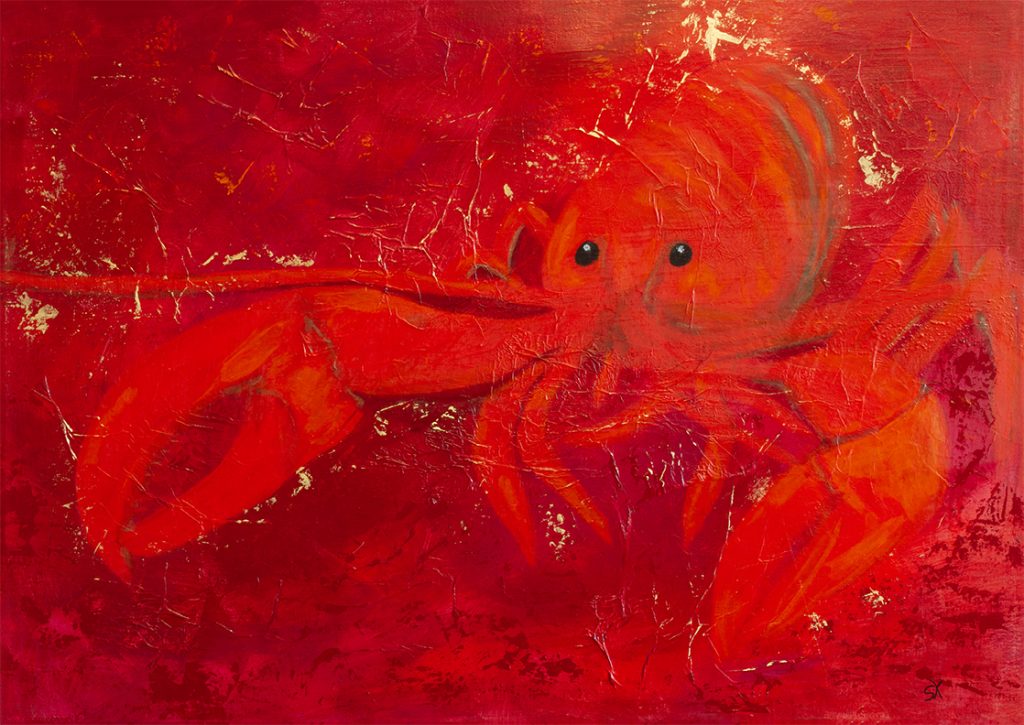 Es ist ein ausdrucksstarkes Stillleben entstanden, welches das Meerestier als farbliches Ereignis inszeniert. Der Hummer erscheint leicht stilisiert und fast spielerisch, wodurch das Werk zwischen Stillleben und expressiver Malerei schwebt.